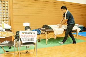 松浦 寛文先生の指導によるストレッチセミナーが行われ泉先生、緒方先生にもご協力いただきながら、ストレッチの基本から学び、自分の身体の硬さのレベルチェックをして、2人で気軽にできるストレッチを教えていただきました。