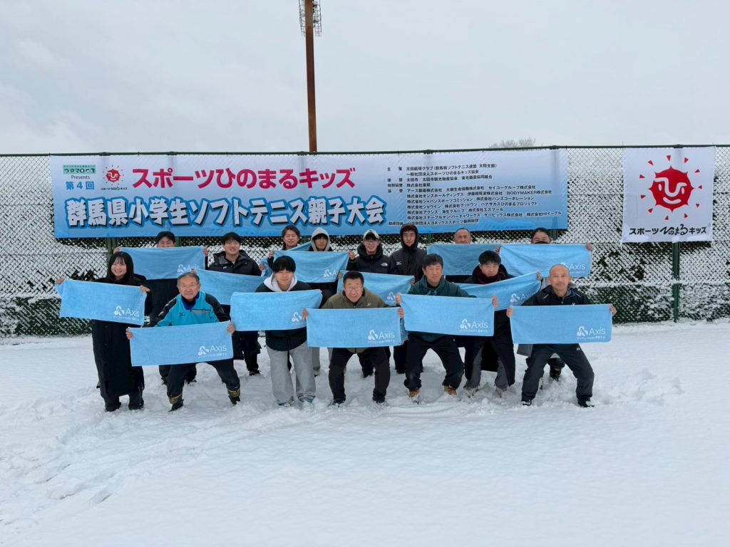連盟の方やお手伝いをしてくれた方に最後アクシス賞タオルをお渡しし、前日設営で貼った幕の前で記念撮影。