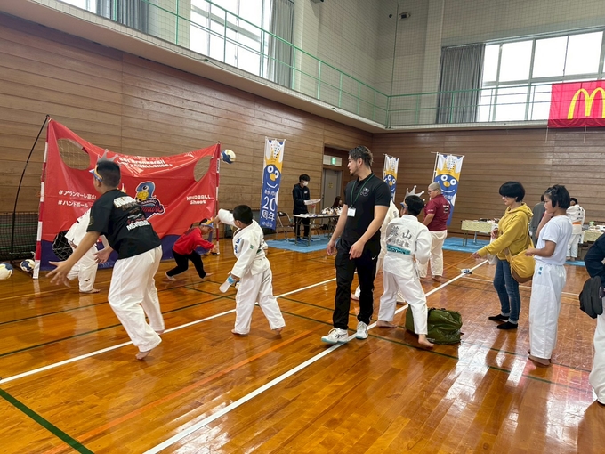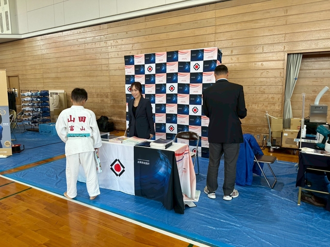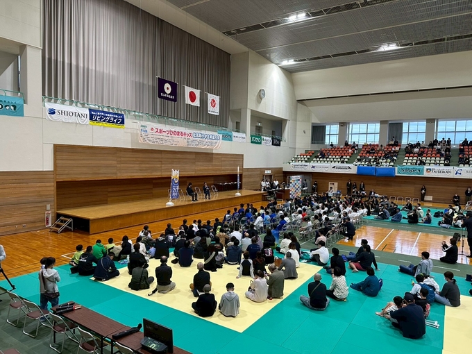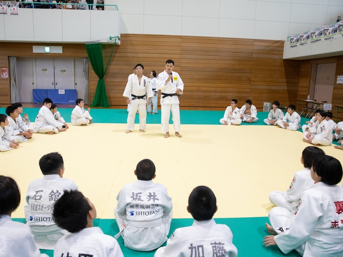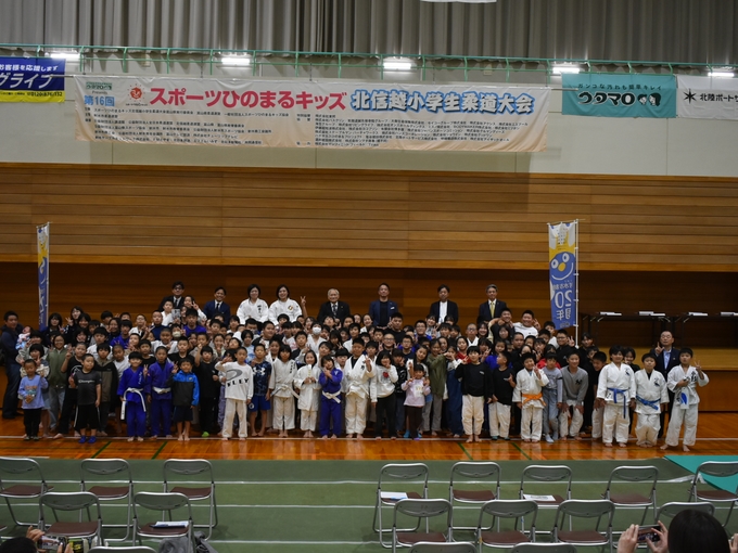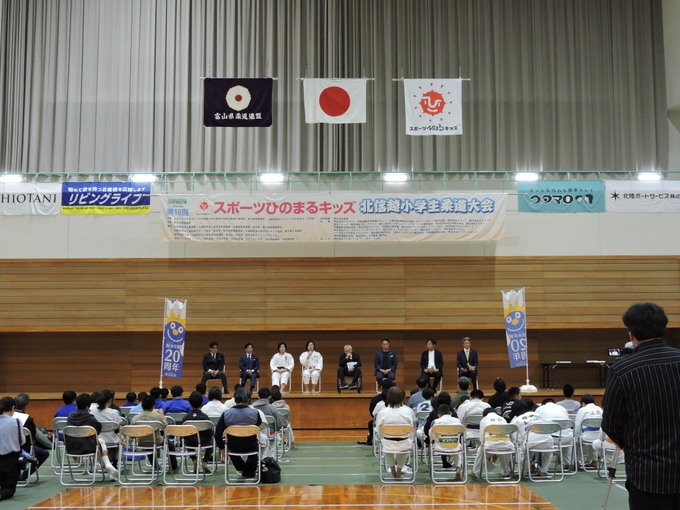 登壇されたのは、オリンピック柔道史上初の3連覇を成し遂げた 野村忠宏先生、グランドスラムで金メダル8個を獲得した 田知本愛先生、リオデジャネイロ五輪金メダリスト 田知本遥先生、射水市長 夏野元志様、富山県柔道連盟名誉会長 橘川謙三様、北陸ポートサービス株式会社 代表取締役 加治幸大様、塩谷建設株式会社 代表取締役社長 塩谷洋平様一般社団法人スポーツひのまるキッズ協会代表理事 永瀬義規様 の8名。